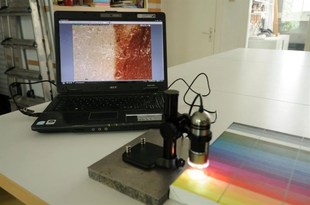 The handheld digital microscope is portable and ideal for use in situations outside of a studio (when plugged into a laptop) for examining large or immovable objects, such as stonework.
