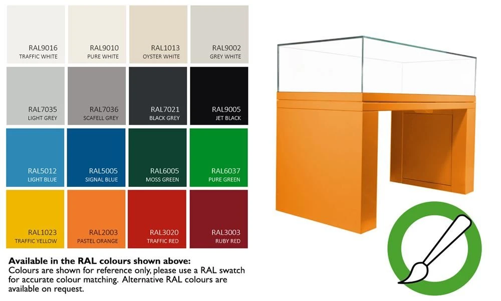 This premium quality display case is made from the highest quality materials and is designed to fit the aesthetics of a wide range of museum and gallery spaces. The all around glass top allows exhibits to be viewed close up and from all angles. Available in your choice of RAL colour. Additional RAL colours will extend delivery lead times and attract an additional charge.