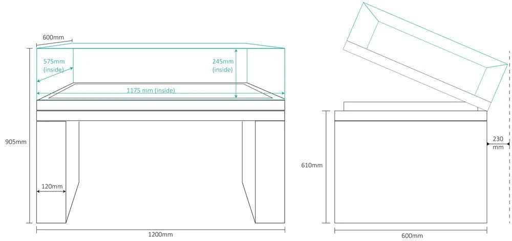 Total Size: 1200mm (Wide) x 600mm (Front to back) x 905mm (High). See images for more detailed dimensions.