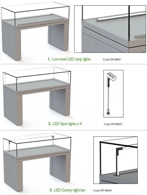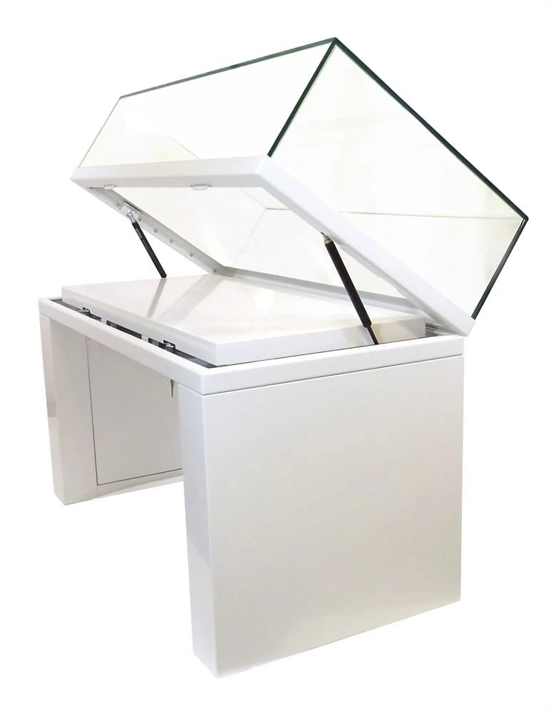 - Glass top seals onto the plinth to prevent pollution from outside the display case, but allows air exchange inside the cabinet around the edge of the table top