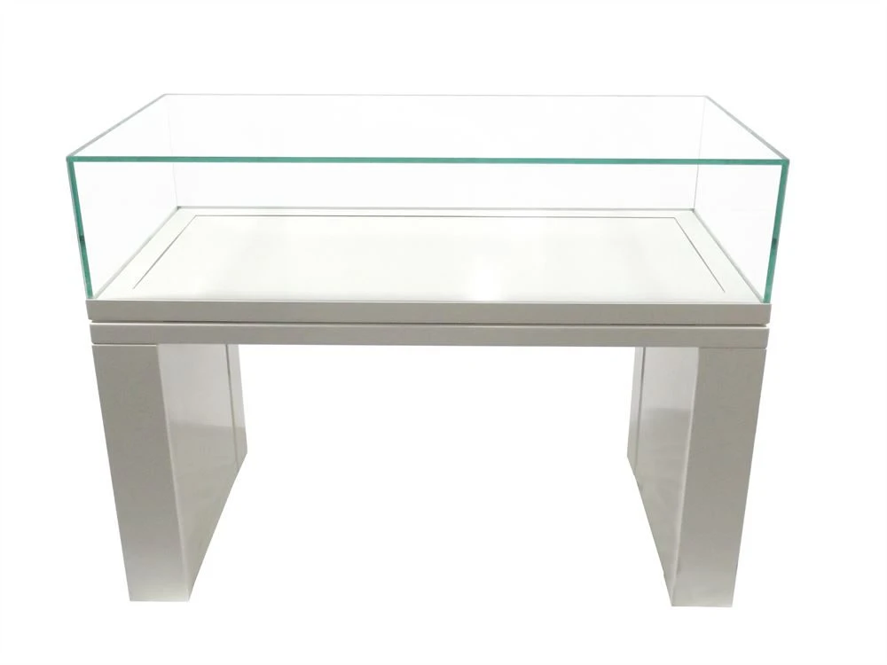 Display case with high security attack-proof laminated glass top and heavy duty powder-coated steel plinth.