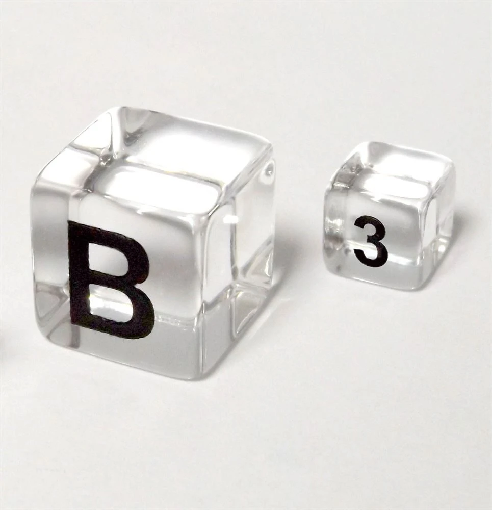 Kit comes complete with thirty 1/2″ (12mm) or thirty 3/4″(20mm) acrylic cubes and four sheets of letters and numbers, two white and two black to fit.