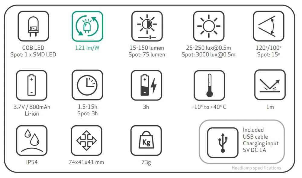 - Powerful COB LED headlamp with two beams | Main light: 15-150 lumen / Spot light: 75 lumen
