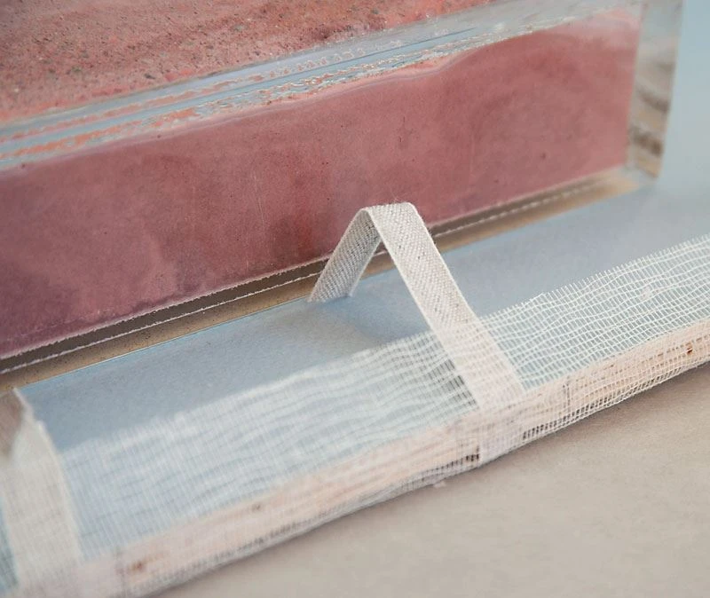 Used for reinforcement of the signatures spine in a casebound book. The super cloth forms the first lining of the spine on the book block. The excess (super hinge) that extends around 1″ beyond the edges of the book block spine is used to attach the body of the book into its case.
