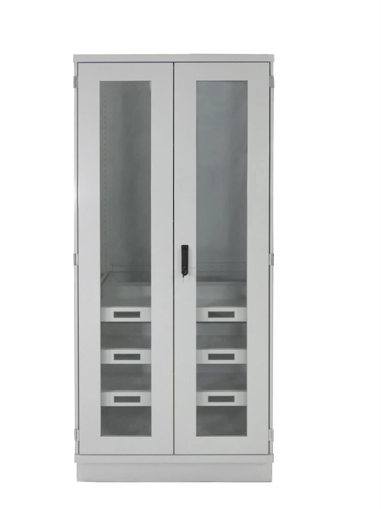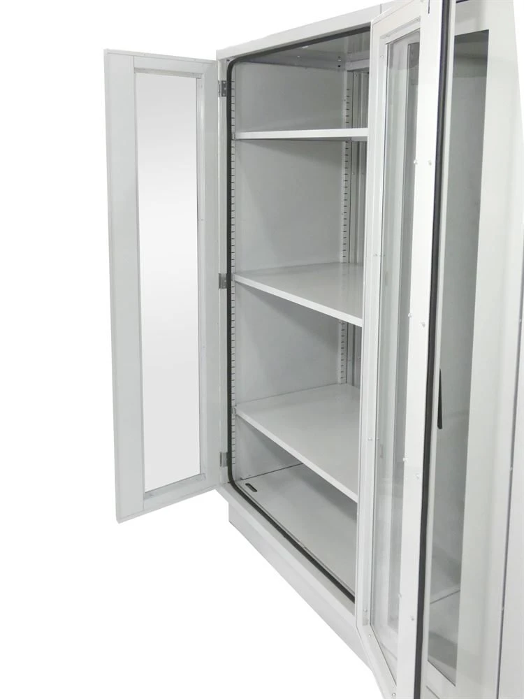 Museum referencing depository cabinet, all steel construction with glazed double doors. Highest quality UK made conservation quality cabinet for storage and display. The interior is fully configurable to your storage or display needs with mounting points for shelves, drawers and hanging rails at 30mm increments (optional extras, drawers, rails or shelves).