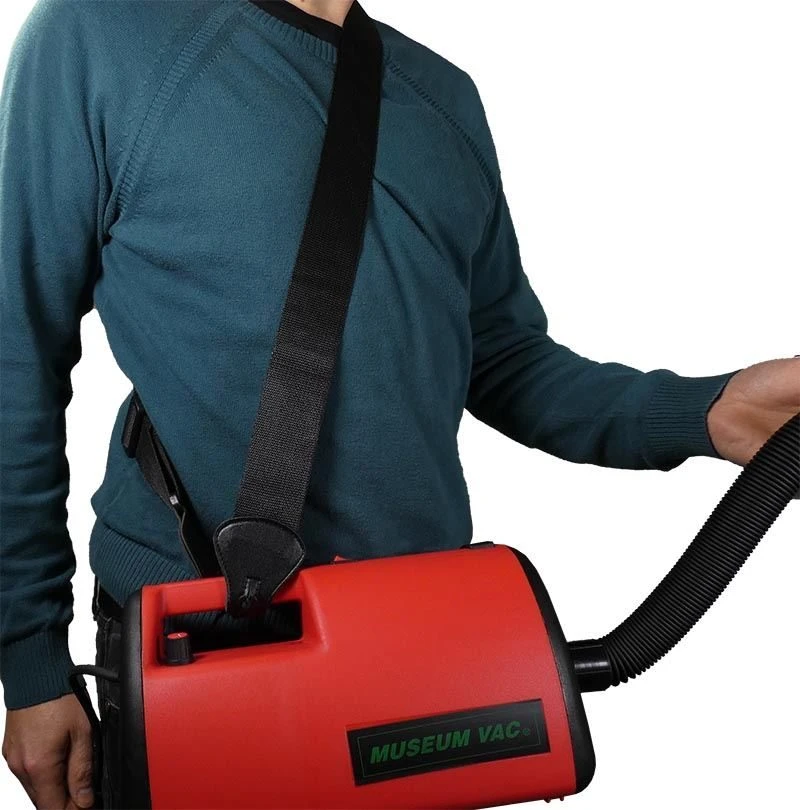 Mildew spores are locked in a disposable HEPA (Grade E10-E11) filter bag by patented valve preventing further contamination. A range of accessories are available for the museum vacuum. Shoulder strap (adjustable up to 140cm) for hands free operation is available for this model, as is a nylon carry bag for the vacuum and all the accessories. Stretch hose without coil back pressure & soft rubber tools prevent chipping and scratching works of art.