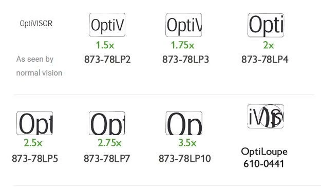 Lens plates available for the following levels of magnification, 1.5x, 1.75x, 2x, 2.5x, 2.75x, 3x.