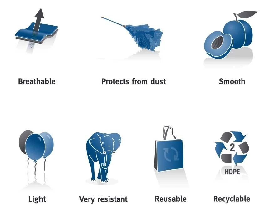 - PEL offers Dupont Tyvek® 1442R 43gsm 145 micron thickness with anti-static finish to prevent dust attraction, the non-reactive coating is inert and not detrimental.