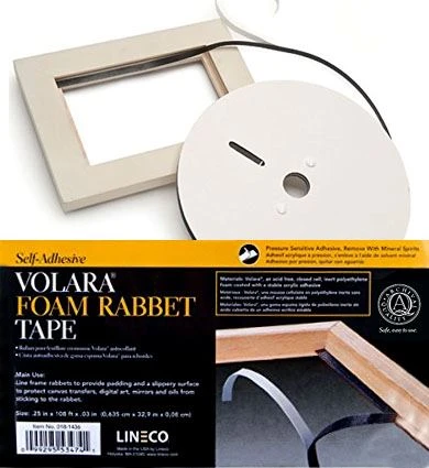 Self adhesive, acid free, framing rebate (also commonly known as rabbet) tape.This inert 1/32” (0.8mm) thin foam tape features a high tack acrylic adhesive for lining frame rebates for good adhesion to wood and most other frame surfaces.